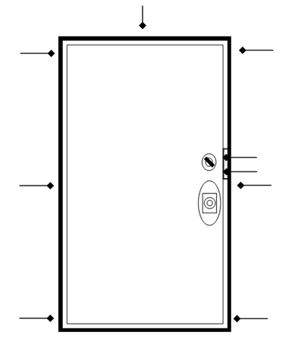 - Three each on the hinge and lock side of frame (top, middle, and bottom)