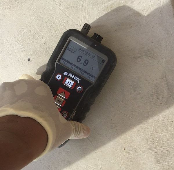 The moisture content is tested by using a moisture meter that measures the percentage of moisture in the concrete. Water in concrete is normal and perfectly fine, but too much water will not allow the coating product to apply correctly.